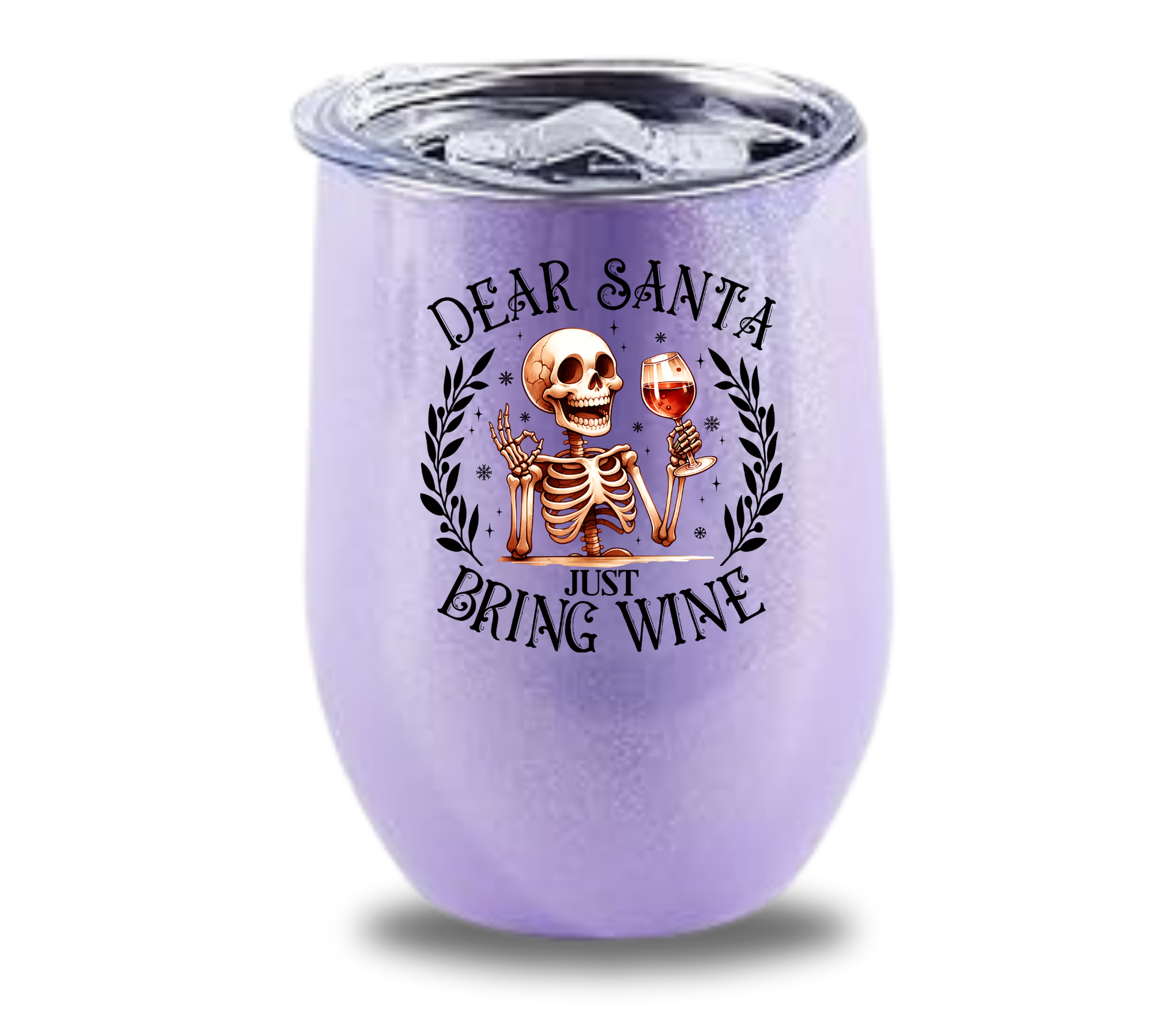 Make holiday wishes with the playful "Dear Santa Bring Wine" purple wine tumbler. Its cheerful color and insulated design keep your favorite wine perfectly chilled, adding festive fun to any celebration. The perfect companion for sipping and dreaming of a merry, wine-filled Christmas!
