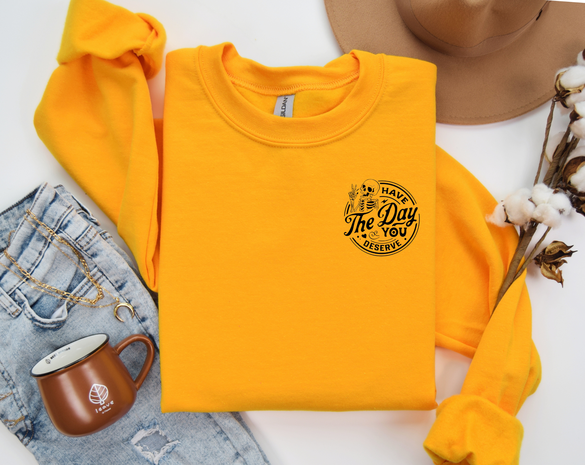 Get cozy with this sweatshirt and have the day you deserve! Perfect for lounging or running errands, this sweatshirt will keep you warm and stylish. Don't just have any day, have the day you deserve with this comfy and cute sweatshirt.