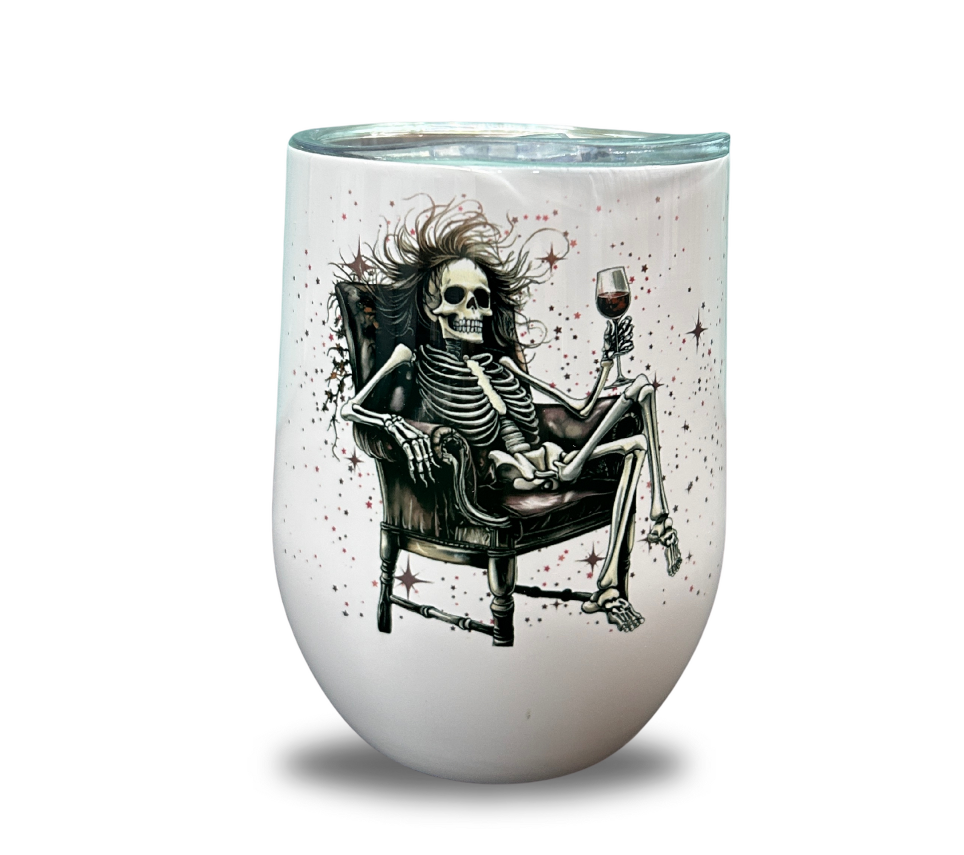 Introducing Chill: the perfect addition to your spooky decor! This skeleton figurine is seen chilling and drinking wine, adding a touch of humor to any space. Let Chill bring some fun and character to your home.