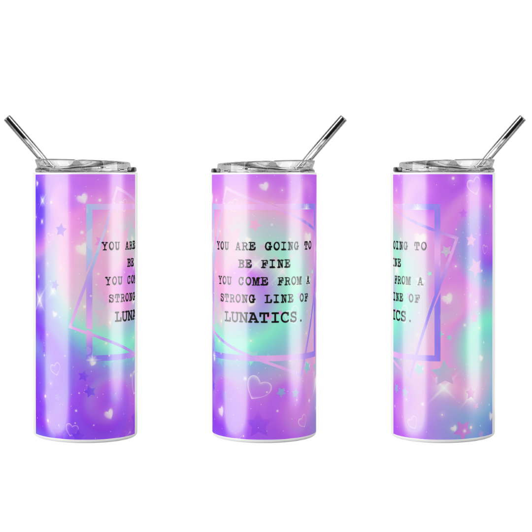 Take a sip of confidence with our 20 oz slim tumbler, because let's face it, you come from a long line of lunatics (in the best way possible). Perfect for your on-the-go lifestyle, this tumbler will keep you hydrated and feeling fine.