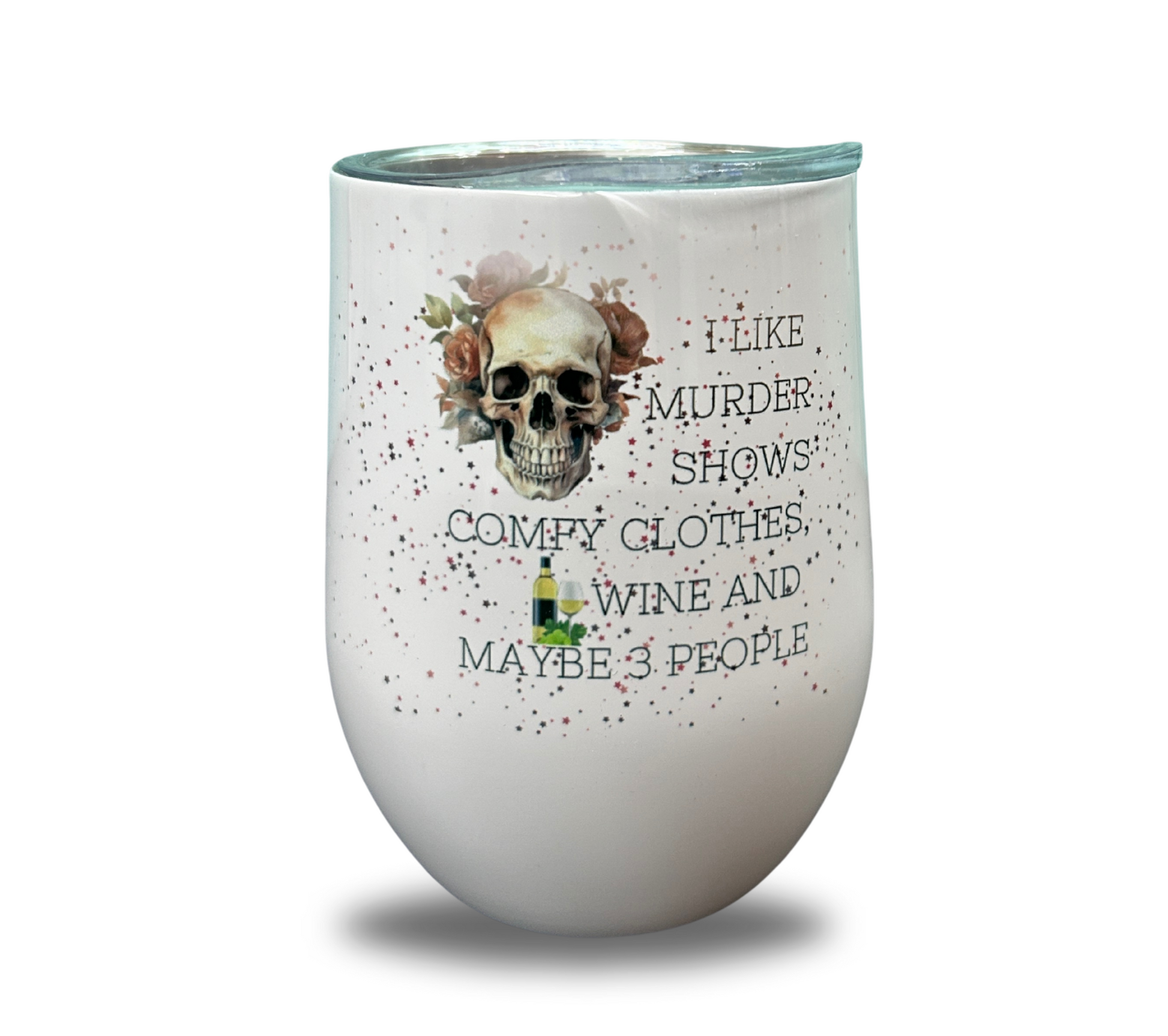 "Stay cozy while indulging in your love for murder shows with our Wine Cup. Perfect for snuggling up in your favorite comfy clothes and enjoying a glass (or three) of your favorite beverage. Who needs people when you have wine and comfy clothes? Cheers!"